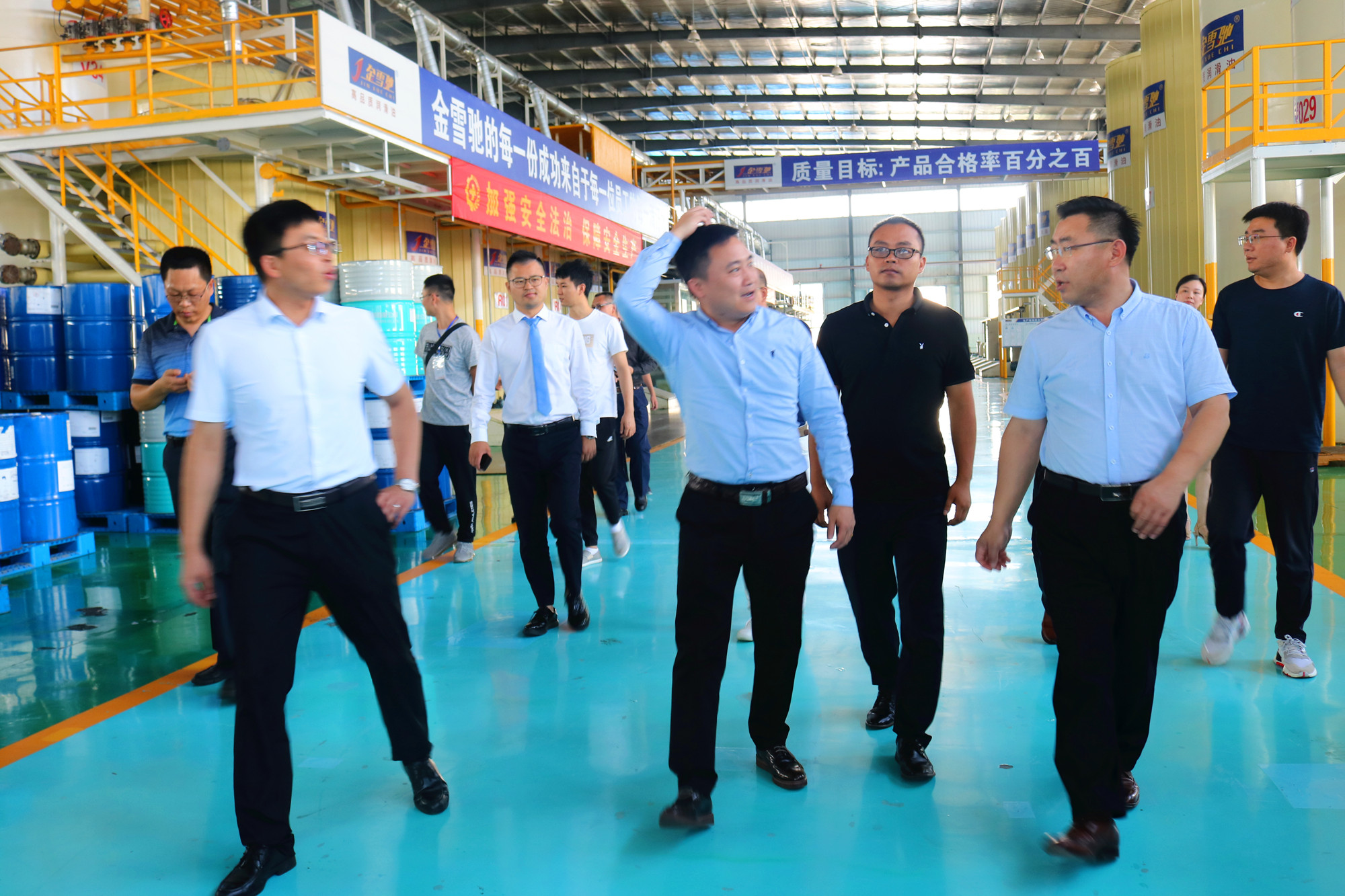 在田總和徐總的引領(lǐng)下,考察團一行先后來(lái)到年產(chǎn)能15萬(wàn)噸數字化生產(chǎn)車(chē)間、榮譽(yù)大廳、金雪馳先進(jìn)潤滑材料研發(fā)中心,現場(chǎng)實(shí)際感受了國家級綠色工廠(chǎng)的基礎油儲存規模、先進(jìn)的生產(chǎn)加工工藝流程、現代化的生產(chǎn)線(xiàn)、嚴格的質(zhì)量管控體系、完善的供應鏈儲運管理系統和國內一流的產(chǎn)品分析檢測評定水平。通過(guò)參觀(guān),考察團一行對金雪馳潤滑油不僅有了更深的了解,更是給予了高度的肯定。這為下一步雙方交流與合作、攜手實(shí)現雙方企業(yè)轉型升級發(fā)展奠定了良好的基礎!
